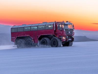 Sleipnir glacier truck is largest and safest way to travel on glaciers and they are custom built to deal with the difficult and hostile glacier terrain. With 8x8 all-wheel drive on 65” and 78” tires, these trucks also boast leather seats, skyline windows, state of the art AC system. They are created with passenger satisfaction in mind and are even equipped with onboard toilets!